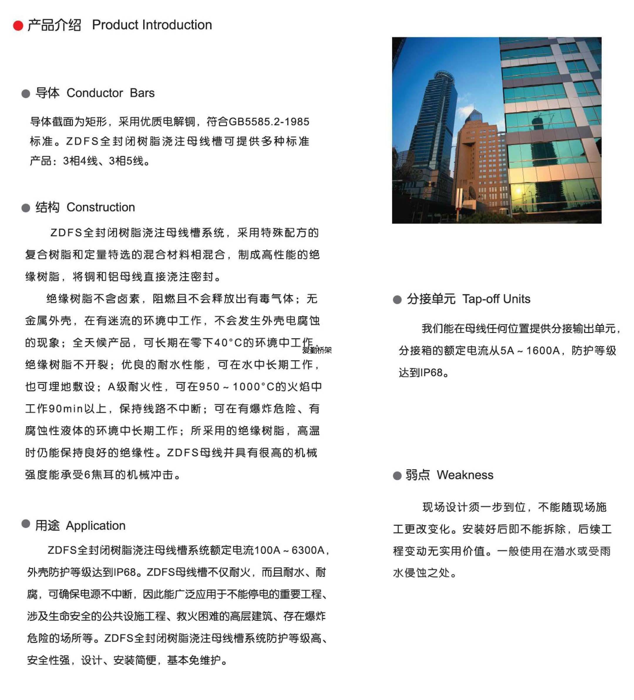 2、 外壳采用不饱和聚酯树脂加石棉等无机材料整体浇注而成,树脂中添加光稳定剂和阻燃剂。也可加装金属外壳,增加了母线系统的抗冲击能力和使用寿命。